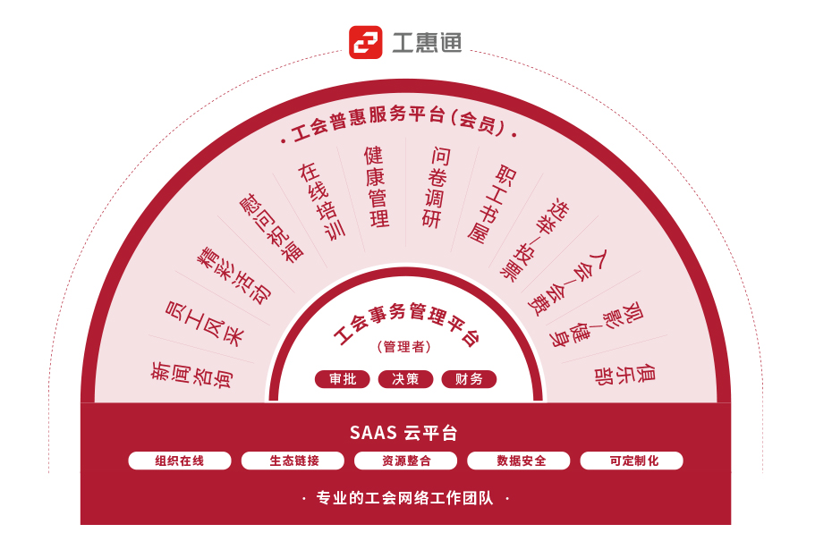 助力客戶工會打造線上線下相互促進、有機融合的新格局。直達客戶工會會員及工會組織,給予工會全領域、多平臺的一站式服務。使工會工作省時、省力、省心。